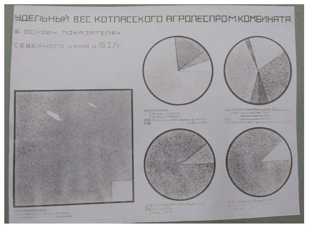 На сегодняшний день существует определенная ограниченность исторических источников по периоду начала 1930-х гг. в муниципальных архивах тех регионов, которые входили в состав Северного края, существовавшего как административный субъект с 1929 по 1936 г., так как значительная часть документов за этот период сосредоточена в архивах г. Архангельск, административного центра Северного края. Поэтому новые источники, не введенные в научный оборот, хранящиеся в муниципальных архивах, представляют большой исследовательский интерес. Полное название документа, описанию которого посвящена статья, называется: «Планы Великоустюгского, Котласского и Лальского районов Северного края: экономические границы, сырьевая лесная база, характеристика сельского хозяйства Котласского агролесопромкомбината с 1932 года по 1937 год, валовая продукция, капиталовложения, рабочая сила по отраслям промышленности с 1931 и 1937 годах, источники электроэнергии и распределение по потребителям на 1937 год, характеристика роста населения с 1926 года по 1937 год, густота движения грузов по водным и железнодорожным путям в 1937 году, удельный вес Котласского агропромлесокомбината в основных показателях Северного края к 1937 году. Составлен ударной бригадой Главного геодезического управления ВСНХ СССР» (МКАУ «Великоустюгский центральный архив». Ф.Р.–205. Оп. 15. Д. 59). В каталоге фондов интернет-портала архивной службы Вологодской области указано, что в деле 34 листа, в листе-заверителе дела имеется запись о 32 подшитых листах (каждая фотография карты или схемы считается как отдельный лист архивного дела). Документ представляет собой альбом 35 х 55 см в горизонтальной раскладке из твердых картонных листов с размещением на каждом листе по две фотографии картосхем, схем или диаграмм, составленных (нарисованных) вручную, также есть два текстовых документа.