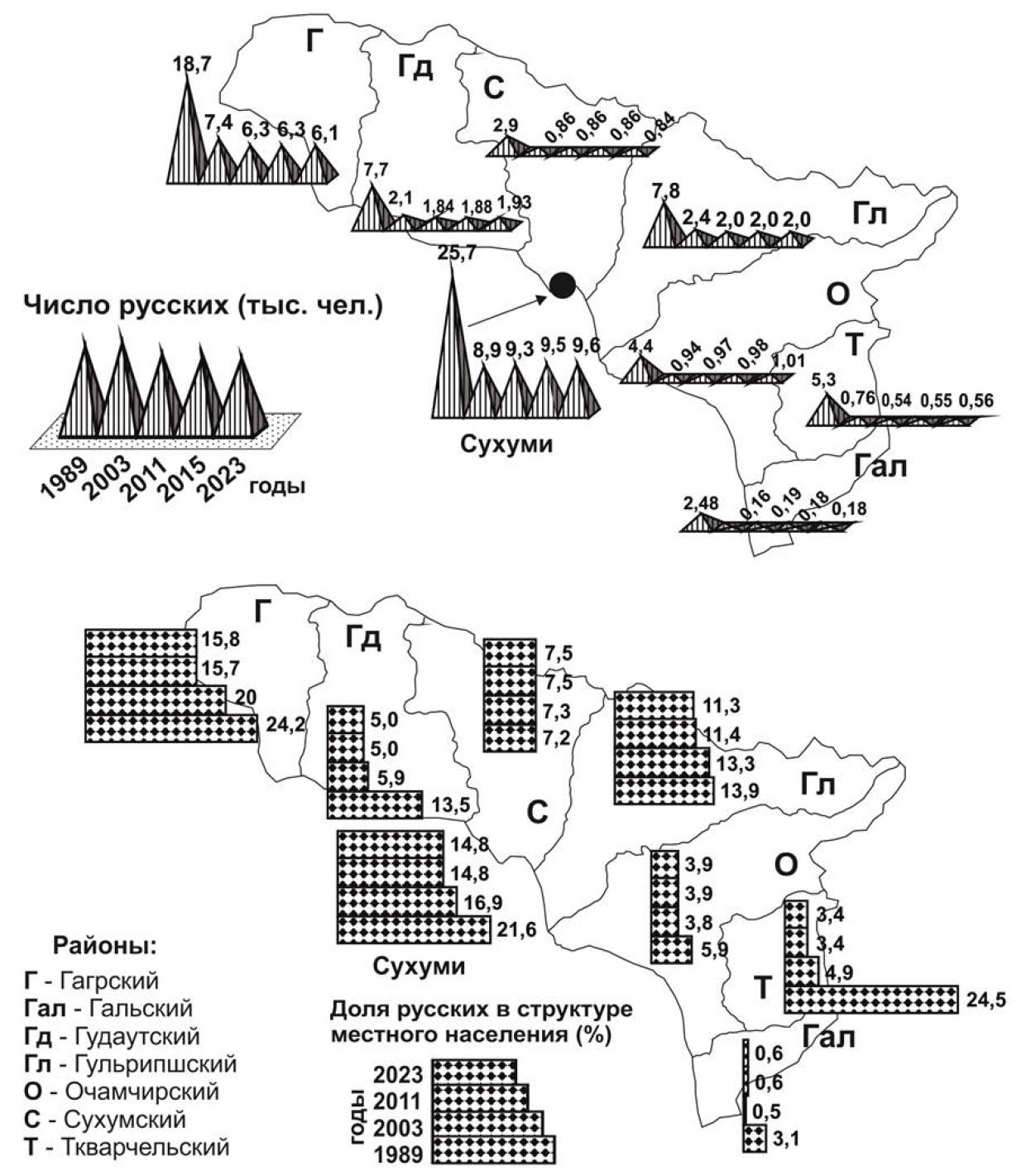 Значительную устойчивость, очевидно, будет демонстрировать и география расселения русских республики, преимущественно включающая приморскую поселенческую сеть с двумя эпицентрами (Сухуми и Гагрский район). С конца 1980-х гг. на них приходилось порядка 70 % всего русского населения Абхазии. При этом с начала XXI в. наблюдалась определенная демографическая «перецентрировка» – если в 2003 г. численность русских Сухуми превосходила русское население Гагрского района на 20 %, то в 2023 г.: уже на 58 %. В любом случае, именно республиканская столица и территории Абхазии, прилегающие к Российской Федерации, будут сохранять свою центральную роль в системе расселения русских республики.