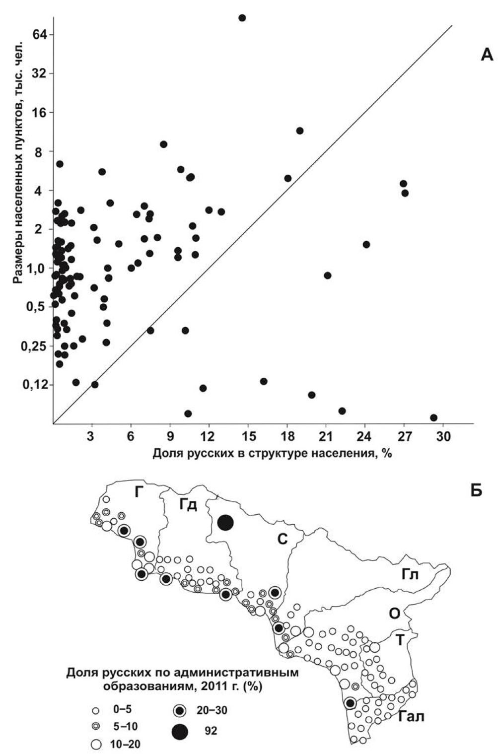 Рис. 2. Система расселения и удельная концентрация русского населения Абхазии, 2011 год