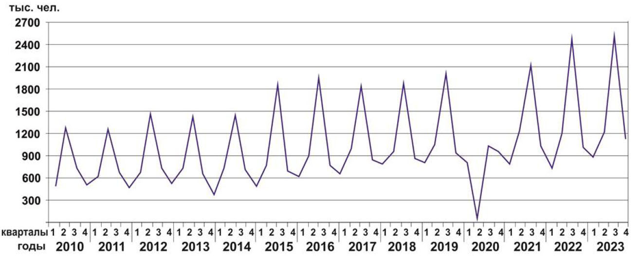 Рис. 3. Динамика российского турпотока в Абхазию по годам и кварталам, 2010–2023 годы, тыс. чел.