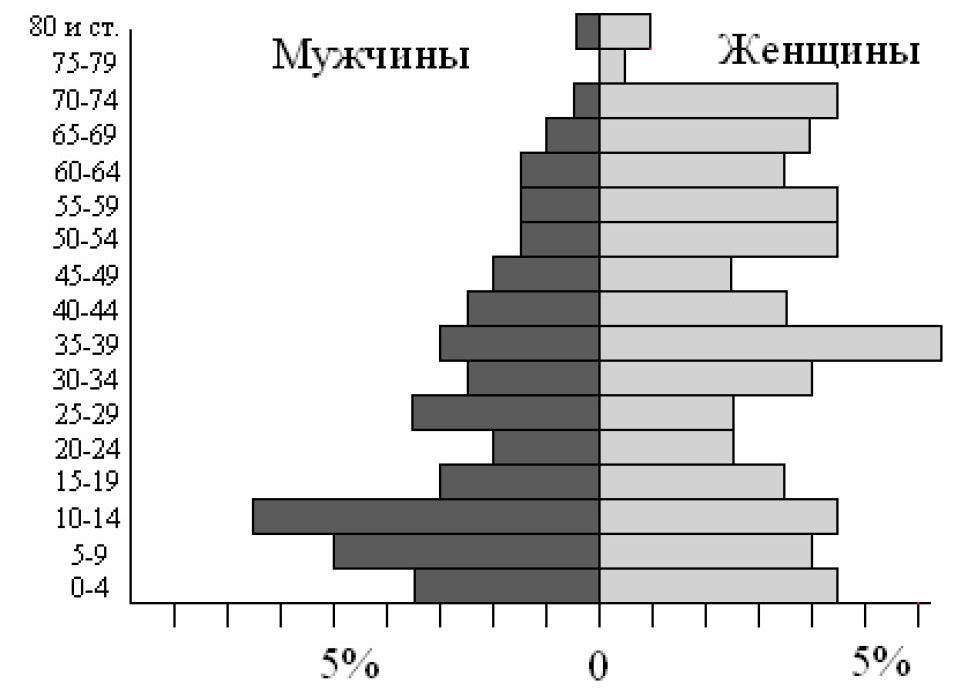Анализ половозрастной пирамиды говорит о том, что довольно высокая доля детей достаточна хотя бы для простого воспроизводства. Но при этом обращает на себя внимание низкая доля девушек 20–29 лет. Это связано с миграцией молодежи в города и ставит под угрозу даже простое воспроизводство коренного населения в будущем. Уже сейчас наблюдается снижение рождаемости из-за сокращения числа молодых семей. Это наглядно видно при сравнении численности трех самых младших 5-летних возрастных групп, т. е. в возрасте, для которого еще не характерны миграции. Доля группы 10–14 лет в общей численности этноса (в нашей выборке) составила 11,0 %, доля 5–9-летних – 9,0, до 5 лет – 8,0 %. Сокращение рождаемости налицо. При такой тенденции в скором времени естественный прирост упадет до нуля, а в дальнейшем приобретет отрицательные показатели. Правда, доля саамов на основной этнической территории вряд ли уменьшится, так как две другие этнические группы на этой территории также имеют тенденцию к сокращению. И коми-ижемцы, и русские не менее интенсивно мигрируют отсюда в города, их численность также сокращается, а естественное движение уже выражается отрицательными показателями.