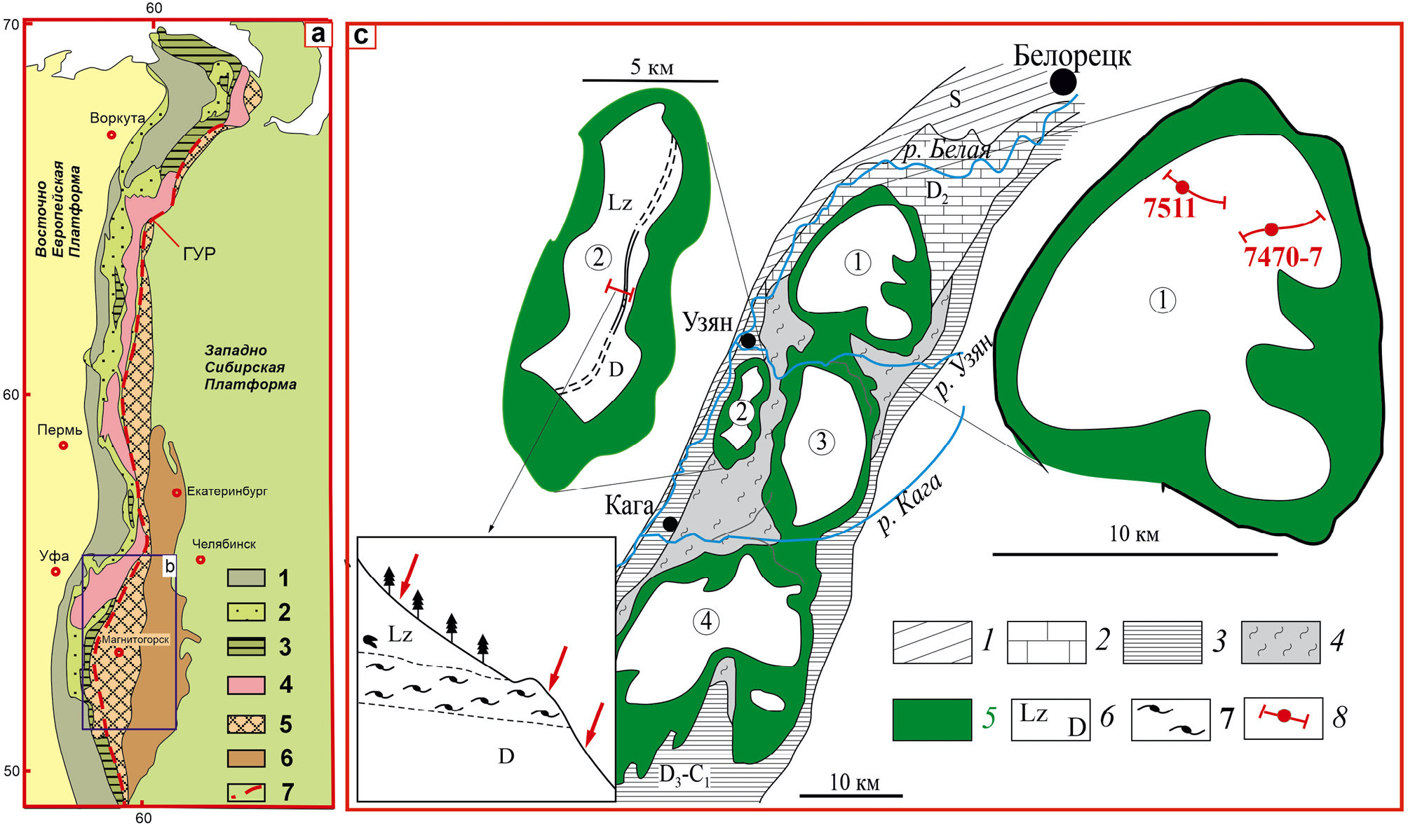 Symbols: a) 1 – Pre-Ural marginal trough; 2 – West-Ural shelf deposits; 3 – West-Ural bathyal deposits; 4 – Central Ural zone; 5 – Tagil-Magnitogorsk zone; 6 – East-Ural zone; 7 – Main Ural fault; c): 1–2 – Silurian and Devonian complexes of the continental slope; 3 – deposits of the Zilair series (D3fm-C1t1) including quartz sandstones, greywackes, shales and limestones; 4 – serpentinite polymictic melange; 5 – apodunite serpentinites; 6 – hyperbasites (Lz-lherzolites, D-dunites); 7 – garnet pyroxenites; 8 – profiles of sampling sites for U-Pb SHRIMP-II and 147Sm-144Nd ID-TIMS dating using isotope geology methods. Figures in circles indicate the massifs of the Kraka group: 1 – Northern, 2 – Uzyansky, 3 – Middle, 4 – Southern Kraka. Arrows in the inset (left lower part of the figure) indicate the sampling sites where zircons were extracted for U-Pb SHRIMP-II dating.
