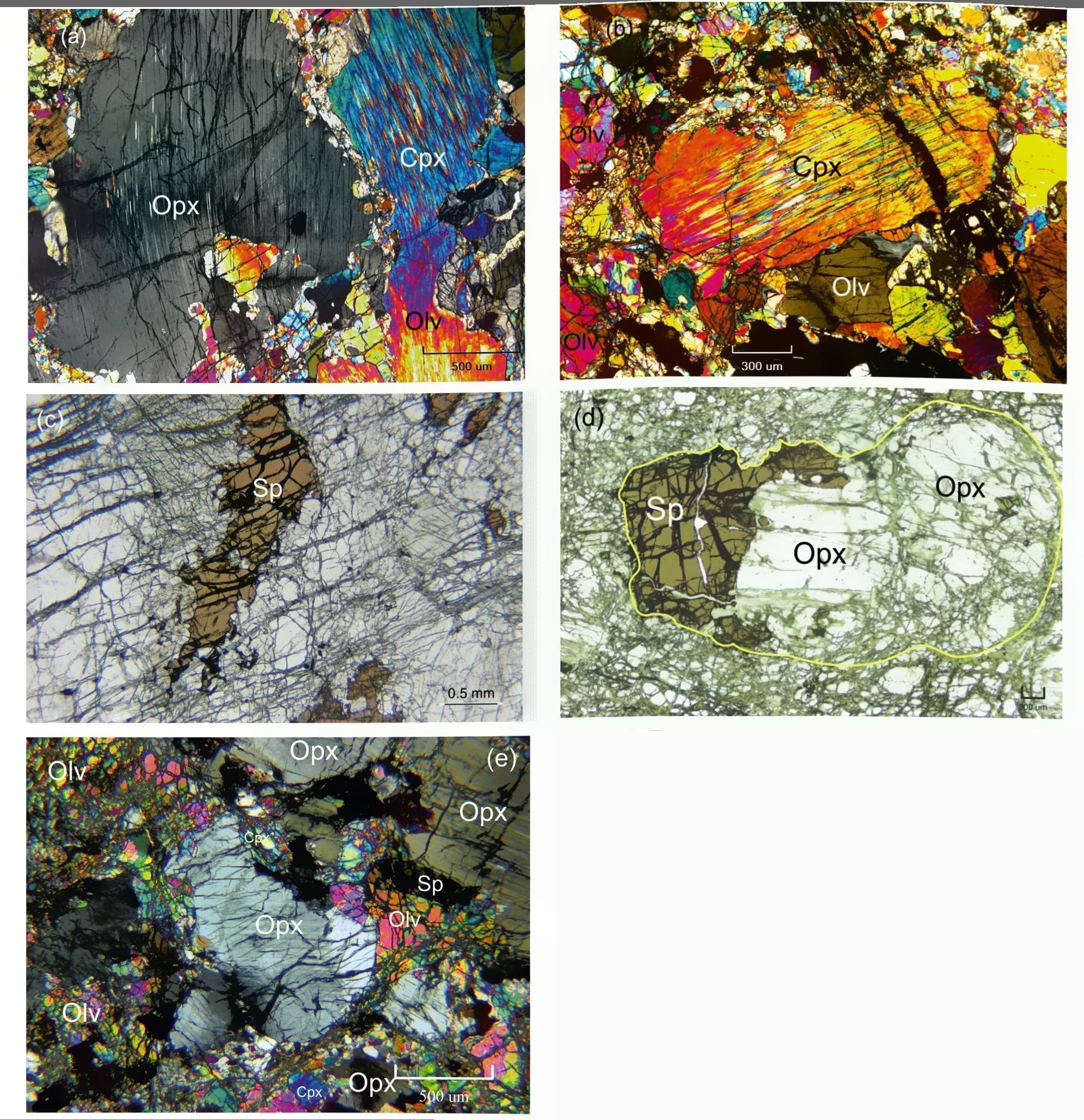 Рисунок 2. Порфирокластические структуры шпинелевых лерцолитов массива Северный Крака. Образец 7511. (a) Ортопироксен-клинопироксеновый порфирокласт, окруженный необластами орто- и клинопироксенов и оливина. Обращают внимание тонкие пластинки – продукты распада порфирокластов: клинопироксена в ортопироксене (Opx) и ортопироксена в клинопироксене (Cpx). Периферические зоны порфирокластов частично очищены от пластинок распада, материал которых был потрачен на формирование необластов. В отличие от пироксенов, оливин (Olv) легко дробится и, как правило, образует необласты. (b) Порфирокласт клинопироксена (Cpx), окруженный необластами пироксенов и оливина. (c) Цепочки зерен хромшпинели (Sp), образованные в ходе пластических деформаций. (d) Апопироповый (?) шпинель-ортопироксеновый кластер – продукт реакции «пироп+2оливина=4ортопироксена+шпинель», в ходе деформаций превращенный в порфирокласт. Образец 7470-7. (e) Ортопироксеновые порфирокласты (Opx) окружены необластами орто- и клинопироксенов и оливина. Обращают внимание продукты распада порфирокластов Opx в форме тонких пластинок клинопироксенов. Периферические зоны порфирокластов частично очищены от пластинок распада, материал которых был потрачен на формирование необластов. В отличие от пироксенов, большая часть зерен оливина (Olv) легко дробится и, как правило, образует необласты