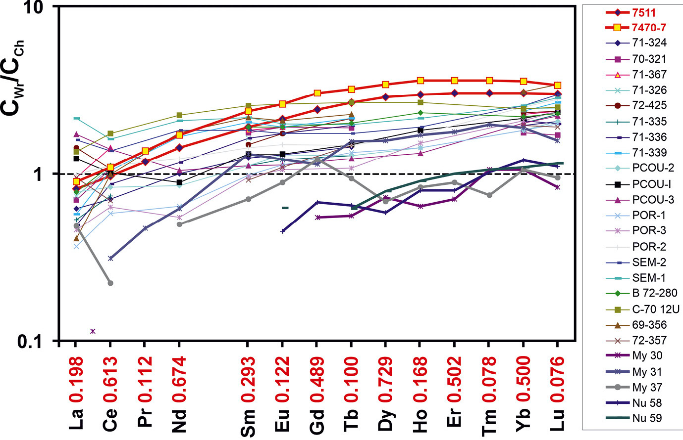 Рисунок 3. Спектры распределения REE в лерцолитах [7] с дополнениями. Тонкие цветные линии – классические лерцолиты восточных Пиреней, номера проб (71-324,…, 72-357) соответствуют таковым из табл. 1A, 1B, 1C [13]. Красные утолщенные линии характеризуют спектры распределения REE образцов 7511 (синие ромбы) и 7470-7 (желтые квадраты), изученных в настоящей работе. Остальные утолщенные цветные линии – лерцолиты массивов Миндяк и Нурали, Южный Урал. Номера проб соответствуют таковым из табл. 1 [14]. CWr, CCh – концентрации REE в породе и хондрите соответственно. Коэффициенты нормализации указаны красными цифрами по оси абсцисс