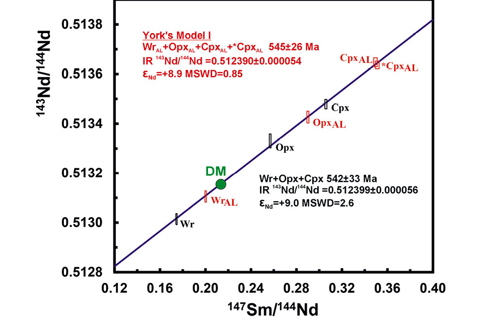 Размах осцилляции концентраций Sm, Nd в изученном образце породы в целом 7511, ортопироксене и клинопироксене, не подвергнутых кислотному выщелачиванию, определяется интервалами 0.149–0.227 ppm и 0.516–0.448 ppm соответственно, диапазоны наблюдаемых атомных отношений 147Sm/144Nd, 143Nd/144Nd идентифицируются значениями 0.1745–0.3058, 0.513014–0.513479 (или +7.4...+16.4 в единицах εNd). Аналогичные параметры для разностей, испытавших воздействие кислот, демонстрируют сравнительное обогащение величин Sm, Nd [ppm], 147Sm/144Nd, 143Nd/144Nd от 1.40, 0.80, 1.13, 1.0002 до 1.68, 1.49, 1.75, 1.0011 соответственно (табл. 2), что значительно увеличивает «растяжку» положения фигуративных точек по осям координат эволюционной диаграммы (рис. 5). Использование программного обеспечения Isoplot/Ex ver. 3,6 [21] для 147Sm-143Nd и 143Nd/144Nd изотопных сигнатур Wr, Opx, Cpx позволяет выявить эррохронную зависимость (MSWD=2.61), определяющую возраст 542±33 млн лет. Единообразные расчеты для WrAL, OpxAL, CpxAL, *CpxAL (дубликат для оценки воспроизводимости) диагносцируют наличие изохроны (MSWD=0.85, York’s model I [21]) с возрастом 545±26 млн лет и высоким значением инициального отношения (143Nd/144Nd)0=0.512390±0.000054 (рис. 5), соответствующим в рамках представлений относительно модельных резервуаров величине εNd=+8.9. Примечательно положение фигуративной точки DM (depleted mantle) на диаграмме (рис. 5), практически удовлетворяющее линии регрессии/изохроне с тангенсом угла наклона 0.00357 (соответствующей возрасту 545 млн лет) и разницей между значениями величин ординат между 143Nd/144NdDM и 143Nd/144Nd(545) всего лишь 0.000007 (абс.), менее чем полученные ±2σ погрешности (табл. 2).