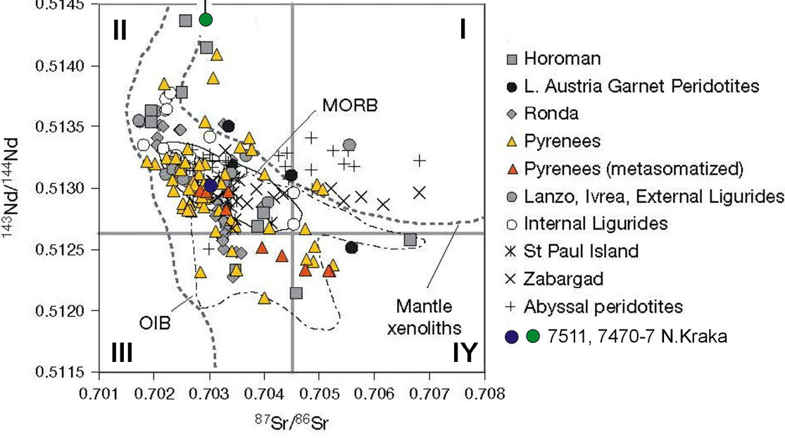 Полученные REE данные, 87Sr/86Sr и 147Sm-143Nd изотопная систематика шпинелевых лерцолитов массива Северный Крака, позволяют идентифицировать генетическую принадлежность изученного вещества. Об этом свидетельствует наблюдаемая корреляционная зависимость 87Sr/86Sr – 143Nd/144Nd (в частности, особенность положения соответствующей фигуративной точки по оси 87Sr/87Sr, II квадрант графика, рис. 5), что вместе со спецификой спектра распределения REE (рис. 3) не противоречит гипотезе о происхождении, предполагающем плавление уже истощенного протолита, который можно идентифицировать как мантийный источник, с параметрами, подобными MORB.