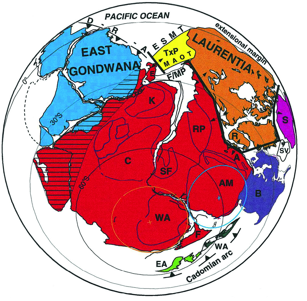 Figure 7. Geologically determined reconstruction of the Pannotia supercontinent, which probably existed near the Precambrian-Cambrian boundary, 600–540 million years [7, 25]. The pan-African-Brazilian (Pannotian; [26]) basins are shown closed, although some of them possibly retained till the Cambrian (see [11]). Notably, the authors of [27] interpreted paleomagnetic data as requiring a separation of Laurentia and Gondwana by more than 5000 km at the Precambrian-Cambrian boundary. The interpretation is primarily based on geological arguments, since the paleomagnetic poles shown do not confirm such a close proximity of Laurentia and Gondwana [25]