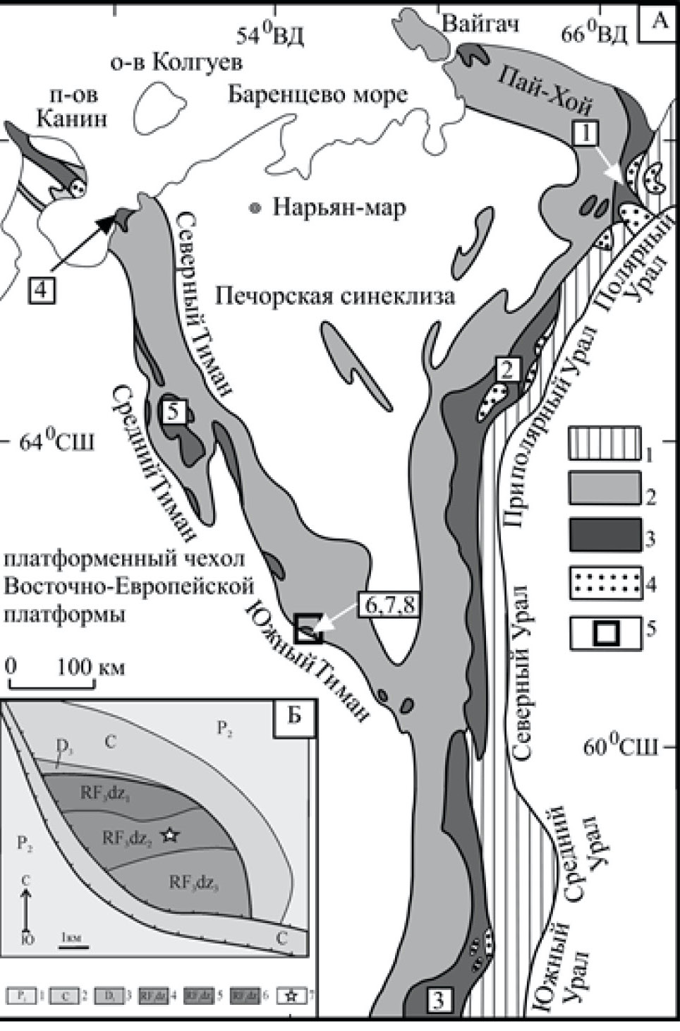 Рисунок 1. А. Схема геологического строения Тимано-Североуральского региона (по: [11, с. 741–760]): 1, 2 – палеозойские формации Урала и Тимана: 1 – палеоокеанические, 2 – палеоконтинентальные; 3 – верхнепротерозойские формации; 4 – нижнедокембрийские метаморфические комплексы; 5 – районы исследований. Цифры в квадратах – места отбора проб (графики показаны на рис. 4): 1 – № 4-28 [12, с. 488–492]; 2 – № 28 [11, с. 741–760]; 3 – № K-12-057 [13, с. 642]; 4 – № 202 [14, с. 14–26]; 5 – [15, с. 384–389]; 6 – № К-21-137 [16, с. 166–169]; 7 – № К-21-142 [16, с. 166–169]; 8 – № ВАД-1 (наши данные). Б. Схематическая геологическая карта Немской возвышенности