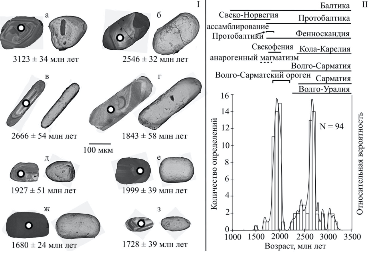 Возрасты единичных зерен составляют: 1480±49 млн лет – обломок прозрачного циркона бледно-розового цвета с гладкой поверхностью и однородным внутренним строением, 1680±24 млн лет – хорошо окатаннное удлиненное непрозрачное зерно темно-розового цвета с равномерно шероховатой поверхностью и однородным внутренним строением (рис. 2, ж), и 1728±39 млн лет – хорошо окатанное удлиненное (Кудл. 1–3) прозрачное зерно светло-розового цвета с шероховатой ямчатой поверхностью и внутренним строением, характеризующимся неравномерным чередованием ярко-серых и серых полос (рис. 2, з).