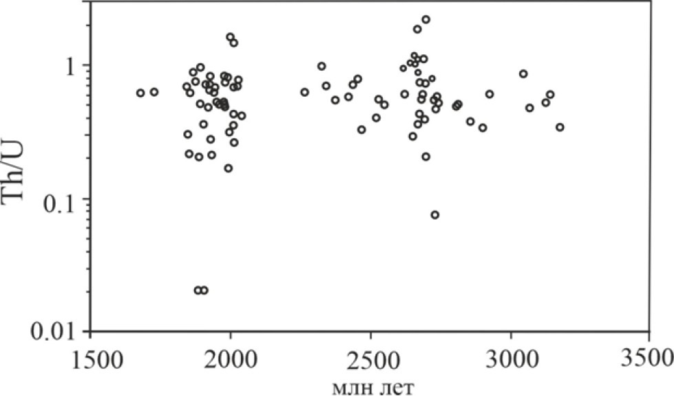 Большинство фигуративных точек зерен циркона всех возрастных диапазонов укладываются в интервал значений 0.3<Th/U<1.1, характерных для большинства магматических и метаморфических горных пород. В пяти зернах позднепалеопротерозойской популяции и одном неоархейском зерне значения Th/U меньше порогового (0.3), характерного для цирконов из метаморфических пород и жильных образований [21, с. 123–138]. Аномально низкие значения Th/U отмечены в трех зернах циркона с низким содержанием Th, источником которых могут быть низкотемпературные граниты [23, с. 635–638]. Источником зерен циркона с величинами Th/U 0.5–0.8 могут быть гранитоиды и метаморфические породы амфиболитовой фации [18; 22, с. 117–133]. Зерна циркона с высокими значениями Th/U (0.8–1.1) свойственны породам высокой степени метаморфизма, а четыре зерна с наиболее высокими значениями (1.44–2.21) могут происходить из мантийных пород основного состава [24, с. 295–312].