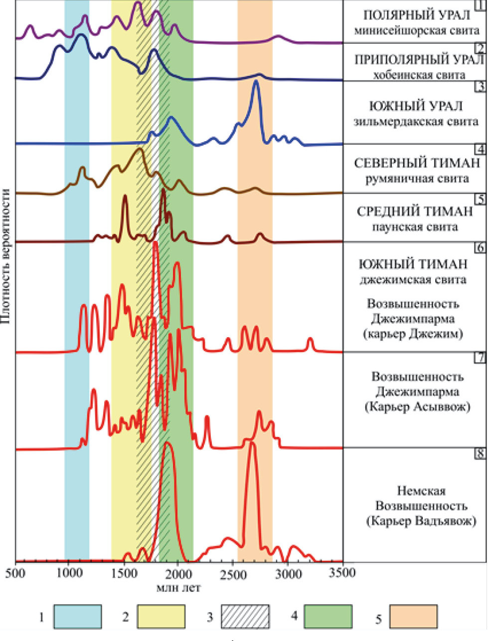 Проведенное сравнение позволяет сделать вывод о широтной смене источников детритовых цирконов, уменьшении с севера на юг доли молодых зерен за счет сокращения области размыва. На относительно небольшой территории Тимано-Североуральского региона накопление терригенных толщ происходило при разных условиях. Источники детритового циркона Северного и Среднего Тимана сходны с источниками циркона севера Урала, включая Приполярный, Полярный и Северный Урал. Значения возрастов циркона из разрезов Южного Урала сходны со с таковыми для Южного Тимана. По мере продвижения на юг молодых значений становится меньше, появляются новые пики с возрастами 2100 и 2500 млн лет, соответствующие не задействованным в формировании более северных разрезов источникам обломочного материала. На графике самого южного разреза Тиманской гряды присутствует только два древних пика. Не исключено, что на Немской возвышенности отложения имеют более древний возраст и представляют нижние, по сравнению со вскрытыми карьером Асыввож на увале Джежимпарма, горизонты джежимской свиты.