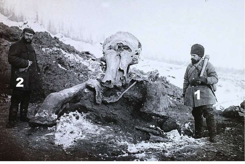Рисунок 1. Березовский мамонт, обнаруженный на притоке р. Колымы. Май 1901 г. 1 – Отто Герц, энтомолог Зоологического музея в г. Санкт-Петербурге, руководитель экспедиции; 2 – Евгений Васильевич Пфиценмайер, палеозоолог