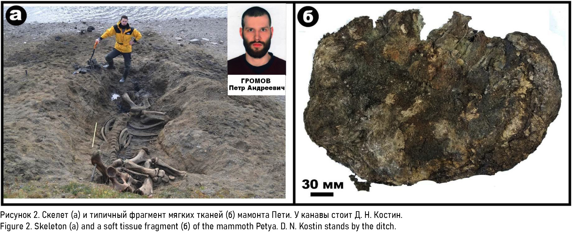 Figure 2. Skeleton (a) and a soft tissue fragment (б) of the mammoth Petya. D. N. Kostin stands by the ditch