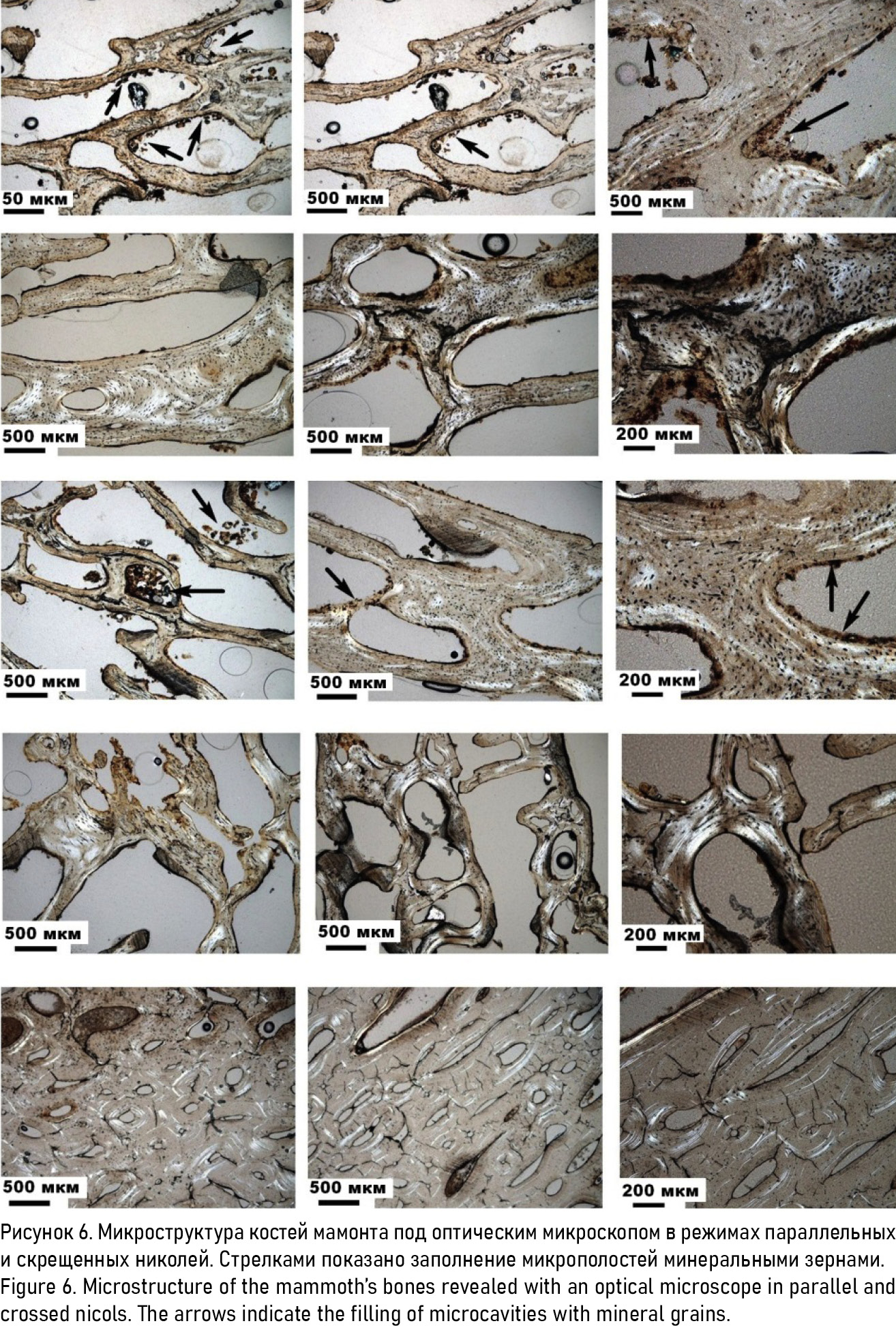 Figure 6. Microstructure of the mammoth’s bones revealed with an optical microscope in parallel and crossed nicols. The arrows indicate the filling of microcavities with mineral grains