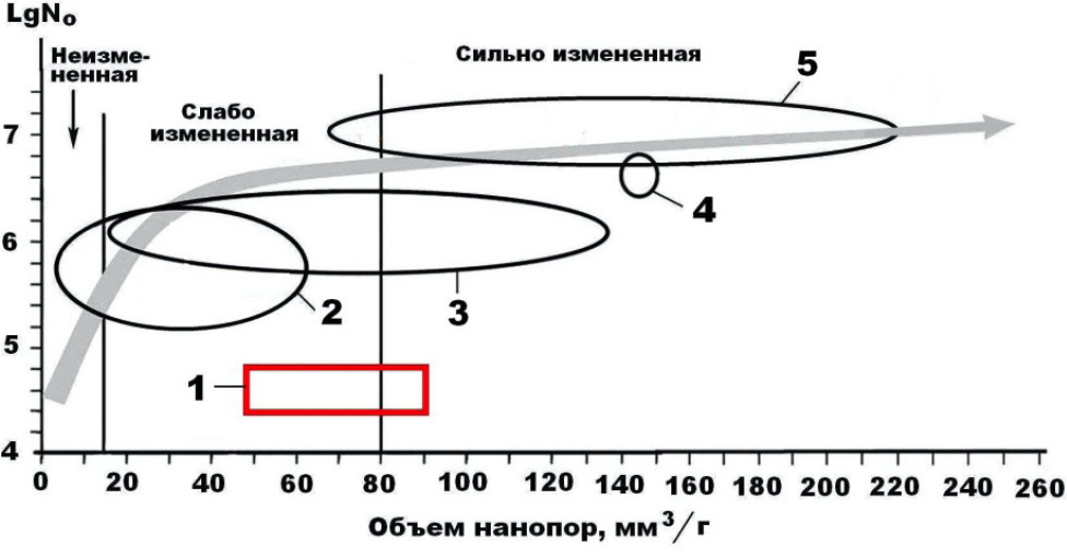 Рисунок 7. Нанопористость костей мамонта Пети (1) на фоне аналогичных данных, полученных нами для мамонтовой фауны (шерстистый мамонт, шерстистый носорог, северные олени, древние лошади) с Печорского Приуралья (2) и Омского Прииртышья (3), для плейстоценовых лошадей со стоянки Заозерье в Пермской области (4) и плейстоценовых млекопитающих со стоянки Ушбулак в Восточном Казахстане (5). Заливкой показан генеральный тренд деградации нанопористости ископаемых костей в ходе их фоссилизации