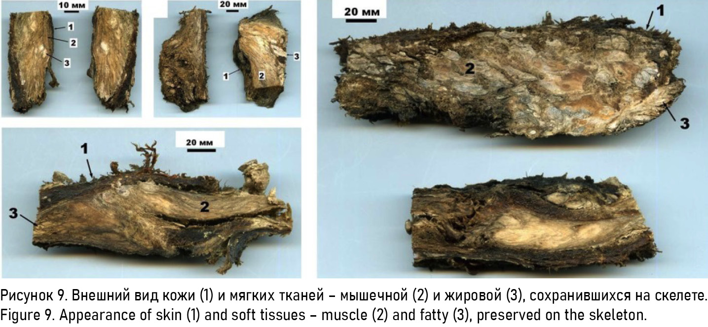 В качестве непосредственных объектов исследований выступали фрагменты костного скелета (ребра и позвонки) и сохранившиеся на скелете волосы, кожа и мягкие ткани, подразделенные по внешнему виду на мышечную и жировую.