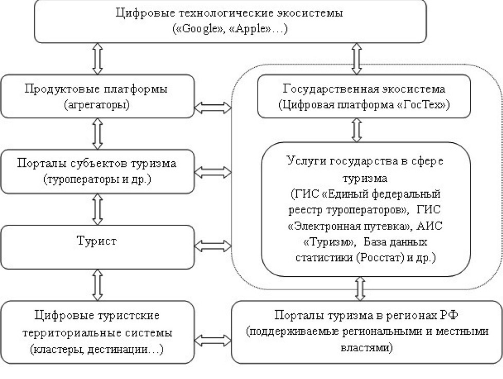 Крупнейшие цифровые экосистемы, такие как Google, Apple и целый ряд других компаний образуют цифровую среду для субъектов туризма, формирующих туристские услуги, и потребителей, создавая условия для оказания цифровых услуг и продуктов.