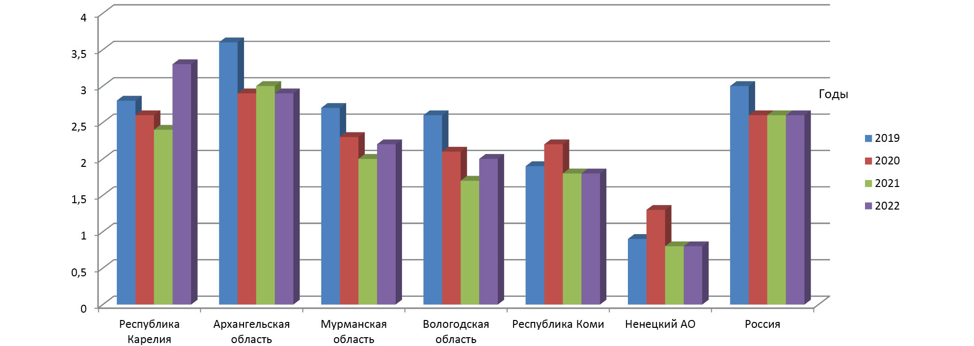 Рисунок 2. Доля валовой добавленной стоимости туристской индустрии в валовом региональном продукте субъекта европейского севера России, %.