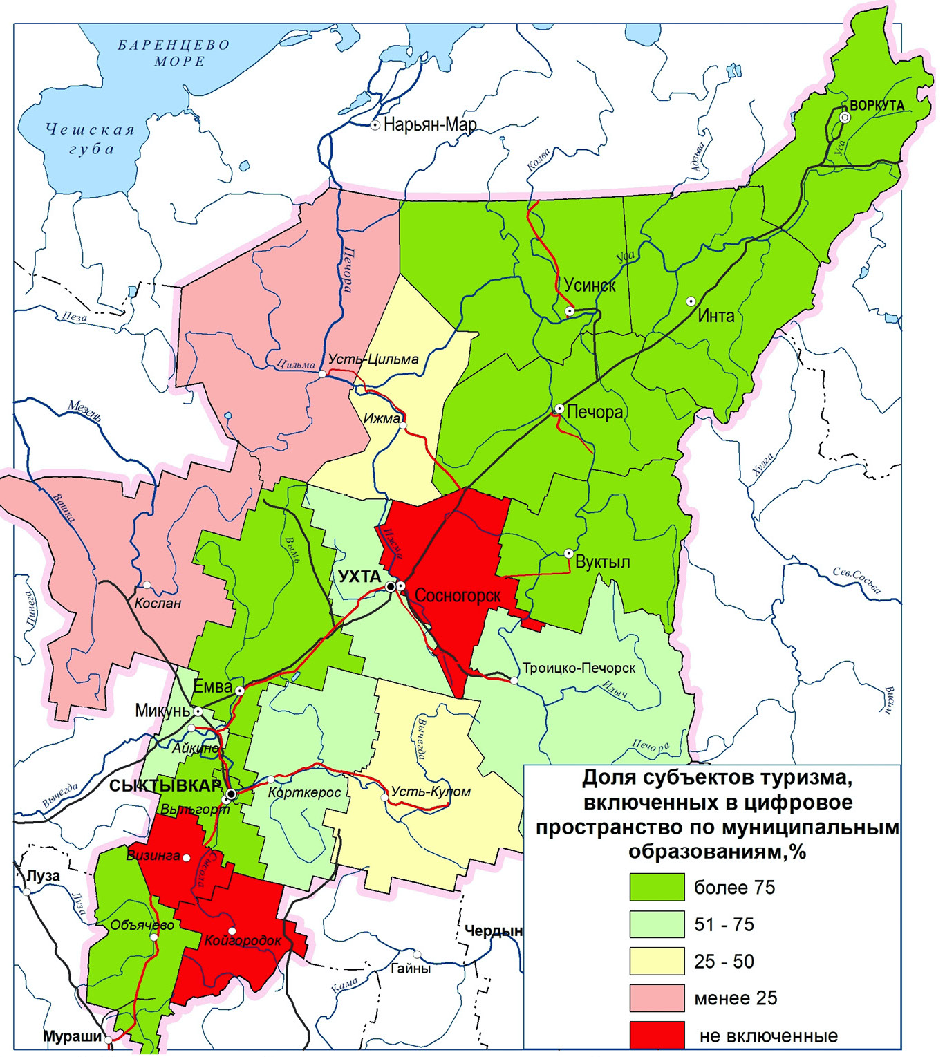 Рисунок 4. Включенность субъектов внутреннего туризма в цифровое пространство муниципальных образований Республики Коми, %.