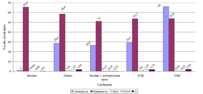 Рисунок. 1. Агрохимические свойства удобрений, в % к абсолютно сухой массе.
