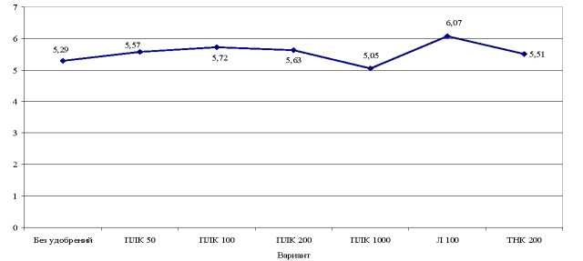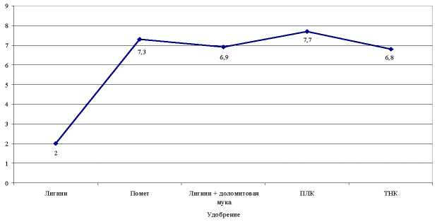 Нейтрализовать кислотность почвы удалось посредством внесения доломитовой муки и ПЛК, что позволило снизить кислотность до нормативного значения (рис. 7).