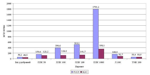 Рисунок 4. Воздействие пометнолигнинового комплекса на содержание фосфора и калия в почве.