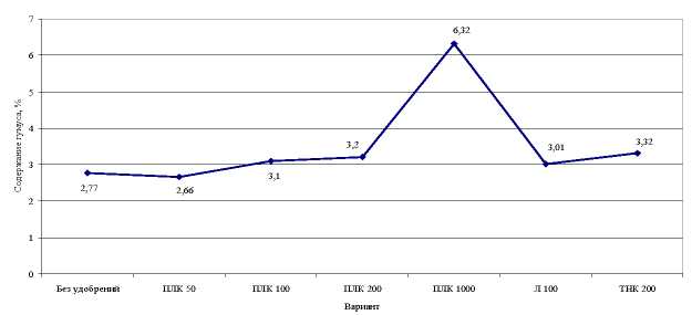 Рисунок 5. Воздействие пометнолигнинового комплекса на содержание гумуса в почве.