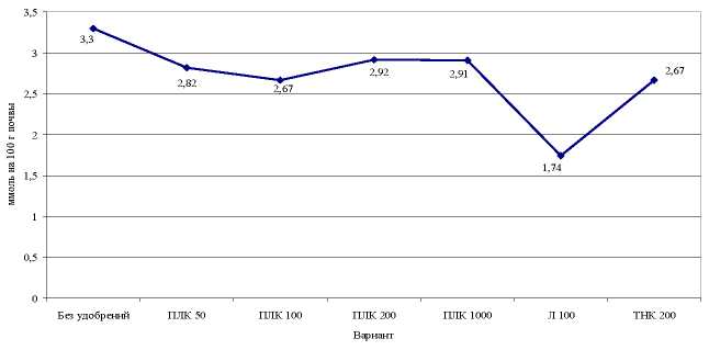 Рисунок 7. Воздействие пометнолигнинового комплекса совместно с доломитовой мукой на изменение гидролитической кислотности почвы.