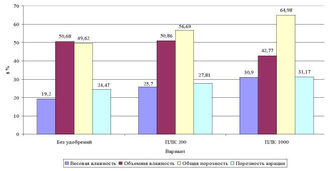 В зависимости от дозы ПЛК наблюдалось увеличение общей порозности почвы на 2,6–15,4 %. Варианту ПЛК 1000 т/га свойственна наибольшая общая порозность (64,98 %), превышающая контрольный вариант на 15,36 %.