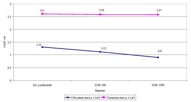 Рисунок 9. Изменение объемной и удельной масс почвы (слой 0–10 см) под влиянием пометнолигнинового комплекса.