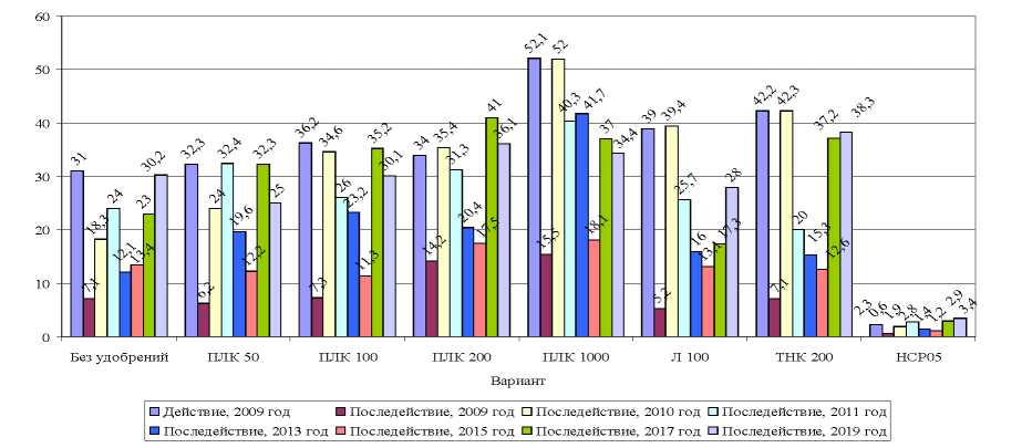 Рисунок 11. Изменение валового сбора многолетних злаковых трав (2008–2019) за счет использования пометнолигнинового комплекса.