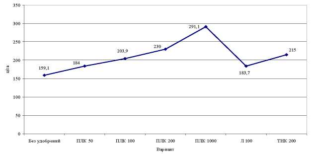 Продуктивность сена увеличивается при повышении доз ПЛК, наиболее высокая доза ПЛК дает наибольший урожай. По результатам восьми лет исследований валовой урожай многолетних трав превысил контрольный вариант на 82,9 % (рис. 11). Сравнивая полученный урожай от использования ПЛК и торфонавозного компоста (доза – 200 т/га), следует отметить, что с помощью ПЛК продуктивность растет с 15 до 230 ц/га.