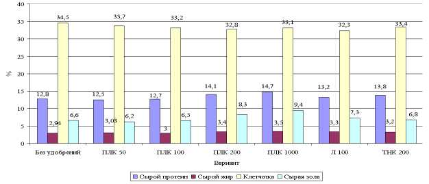 Согласно рис. 12, применение ПЛК в наибольшей дозе позволило увеличить в сене сырой протеин на 1 %; сырую золу – на 0,2 %; сырой жир – на 0,26 %; содержание клетчатки снизилось с 34,5 до 33,4 %.