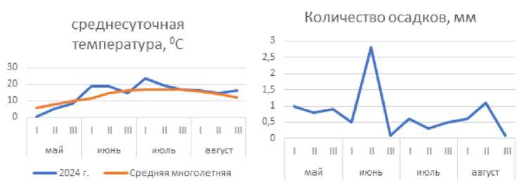 Средняя температура воздуха за июль, равно и август, 2023 и 2024 гг. была выше средней многолетней нормы. Однако количество осадков 2024 г. было ниже среднемноголетнего значения и, соответственно, показателя 2023 г.