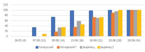 Из рис. 3 видно, что динамика всходов сортообразца Печорский после обработки ЭМИ в 2023 г. отличается от динамики всходов сортообразца Печорский Т (обработка 2021–2023 гг.) и сорта Зырянец, обработанных в 2023 г. и 2021–2023 гг. Эффективность однократной обработки была выше по сравнению с многократной (на протяжении 2021–2023 гг.).