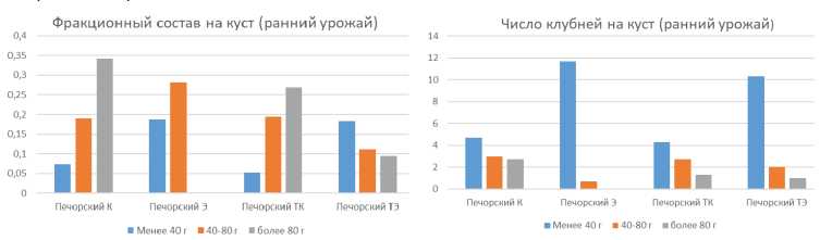 Из приведенных данных биометрических показателей общей урожайности видно (таблица), что среднее количество клубней на куст в урожае обработанных клубней фракций существенно больше, чем в урожае от необработанных ЭМИ (НСР=2,14). Превышение показателей общего урожая, полученного от необработанных в 2024 г. клубней, можно объяснить улучшенным плодородием экспериментального участка. Необходимо отметить, что урожайность варианта Печорский ТЭ выше, чем у варианта Печорский Э. В данном случае можно предположить, что эти отличия связаны с изменениями генотипа после обработки ЭМИ.