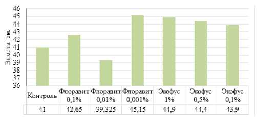 На варианте без обработки препаратами средняя высота растений люпина узколистного в условиях Вологодской области в 2023 г. достигла 41,0 см. Применяемые препараты различно влияли на высоту растений люпина. Наиболее высокими растения люпина были при использовании биорегуляторов Флоравит®-3Р в 0,001%-ной концентрации (45,1 см) и Экофус в 1%-ной концентрации (44,9 см), что выше растений контрольного варианта на 9-10 %. Препарат Флоравит®-3Р в концентрации 0,01 % привел к некоторому уменьшению высоты растений люпина узколистного по сравнению с контрольным вариантом.