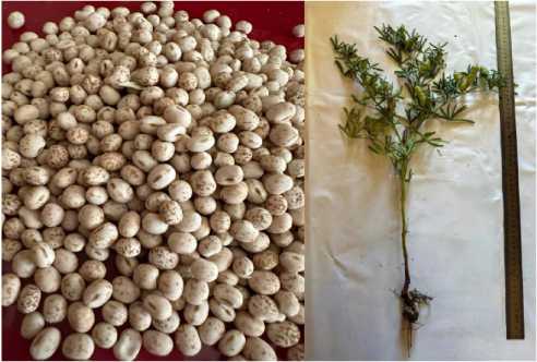 Объект исследования – сорт люпина узколистного Ладный. Выведен в Московской сельскохозяйственной академии имени К. А. Тимирязева и Федеральном исследовательском центре «Немчиновка». Включен в Госреестр по Северо-Западному региону [9, с. 233]. Представляет собой однолетнее раннеспелое самоопыляющееся растение, имеющее детерминантный, темно-зеленый стебель высотой до 50 см. Сорт интенсивного типа с высоким генетическим потенциалом семенной продуктивности, разновидность альбозирингус. Корневая система мощно развита, обладает способностью усваивать малодоступные фосфаты и другие минеральные соединения. Семена мелкие, округлые, кремово-белые, рубчик светлый. Масса 1 тыс. семян – 111–132 г. Средняя урожайность семян – 31,3 ц/га, зеленой массы – 377 ц/га. Содержание протеина в семенах – 33,5–35 %, алкалоидов – 0,001–0,015 %. Вегетационный период – 70–90 дней [10, с. 107]. На фото 2 представлены семена люпина узколистного сорта Ладный и внешний вид выращенного растения.