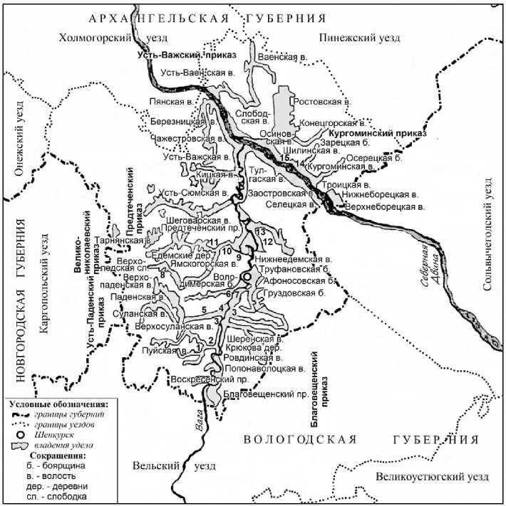 Условные обозначения. Благовещенский приказ – 1 Нижнепуйская в.; Усть-Паденский приказ – 2 Усть-Пуйская в., 4 Усть-Паденская в., 5 Шелашская в.; Великониколаевский приказ – 3 Федоровская б., 6 Исаковская б., 7 Есиповская б., 8 Котажские дер., 9 Васильевская б., 10 Ивановская б., 11 Усть-Тарнянские дер.; Предтеченский приказ – 12 Сметанинская в., 13 Химаневская в.; Усть-Важский приказ – 14 Корбальская в., 15 Прилуцкая в.