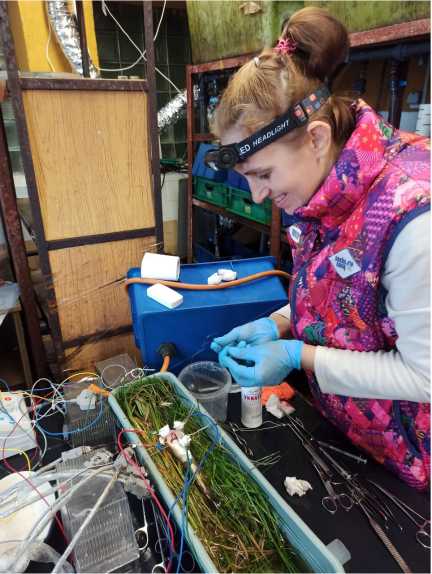 Заведующая лабораторией физиологии сердца к.б.н. М. А. Вайкшнорайте проводит исследования сердца рыб на биологической станции МГУ на Белом море.