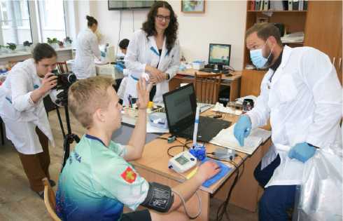 Комплексное обследование спортсменов в лабораторных условиях проводят сотрудники отдела экологической и медицинской физиологии, на первом плане (слева направо): В. Н. Тюкавкина, А. К. Веселик, к.б.н. И. О. Гарнов; в левом углу за столом (слева направо): к.б.н. Н. А. Вахнина, к.б.н. Ж. Е. Иванкова.