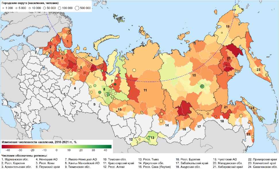 Figure 1. Population change by the municipalities in the North of Russia, 2010-2021 (performed at the Laboratory of Demography and Social Management).