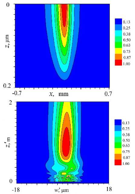 Figure 1. Reflected intensity distribution inside a curved multilayer Pd/B4C X-ray mirror (top) and a two-dimensional map of focusing by this mirror (down).