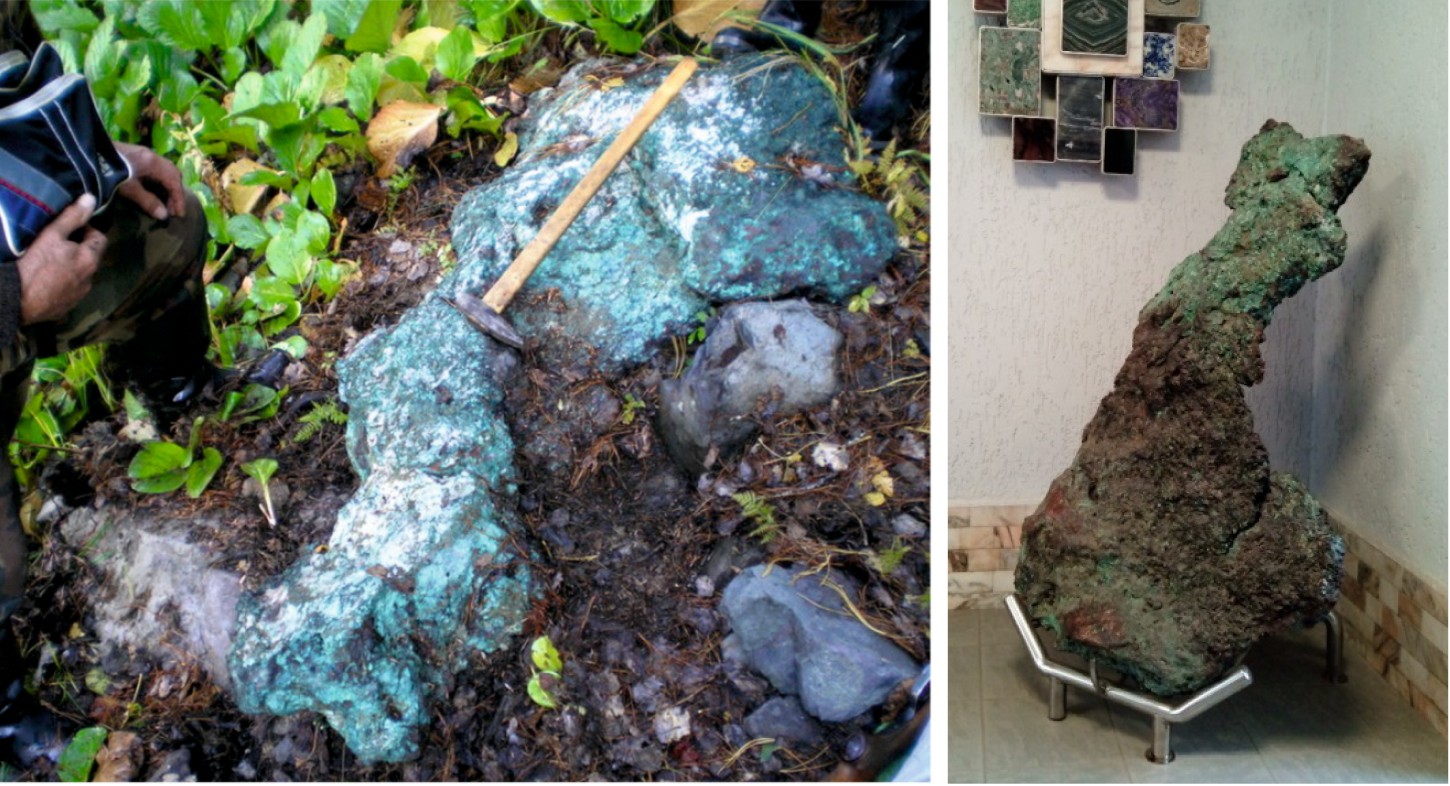 Figure 2. The large copper nugget from the Taymet deposit weighing about 700 kg. Left photo was taken at the place where it was found, right – on exposition at the Central Siberian Geological Museum at the Institute of Geology and Mineralogy SB RAS (Novosibirsk).