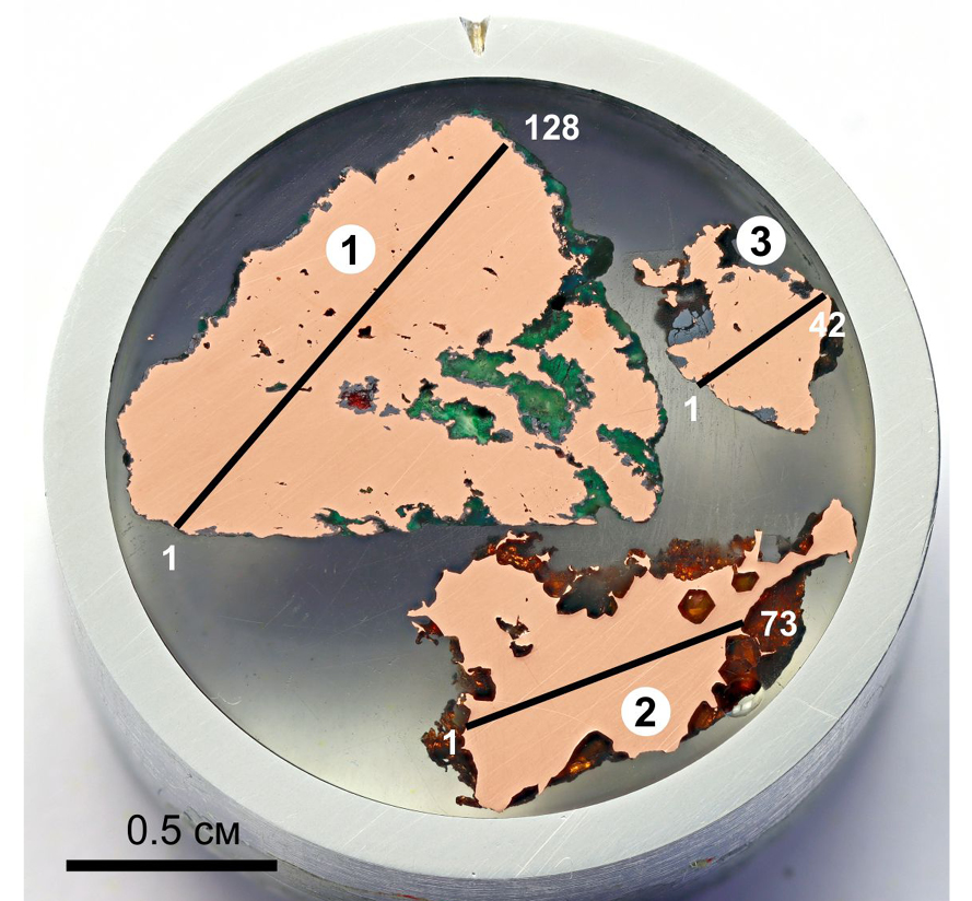 Рисунок 3. Шашка-препарат с фрагментами самородной меди. 1 и 2 – фрагменты самородка из Тайметского месторождения (музейный № I-2/30); 3 – фрагмент самородка из месторождения на п-ве Кивино (музейный № I-2/11). Черными линиями указаны направления сканирования с шагом 0,1 мм. Цифры рядом с ними указывают на положение первых и последних точек измерения.