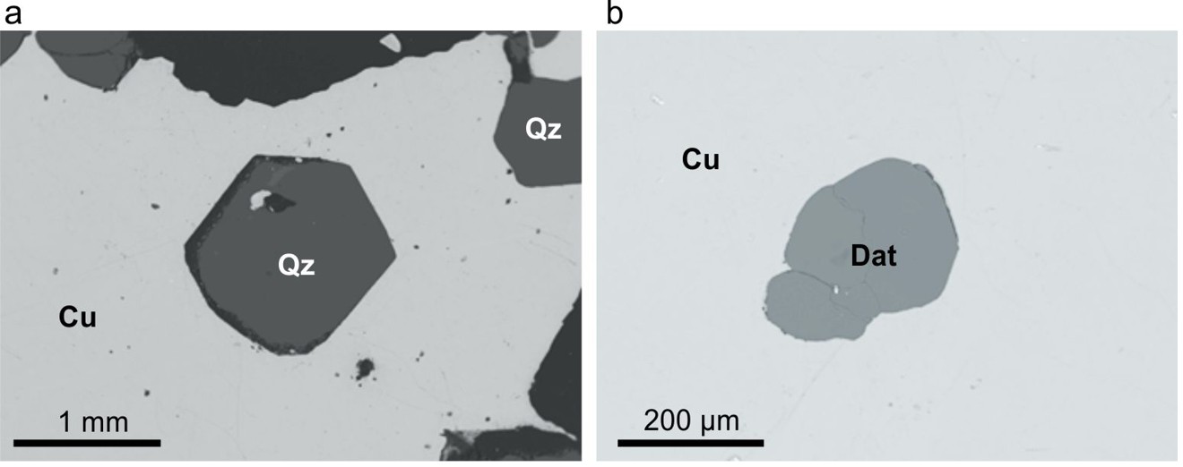 Рисунок 4. Микровключения идиоморфных кристаллов кварца (a) и датолита (b) в самородной меди Тайметского месторождения.