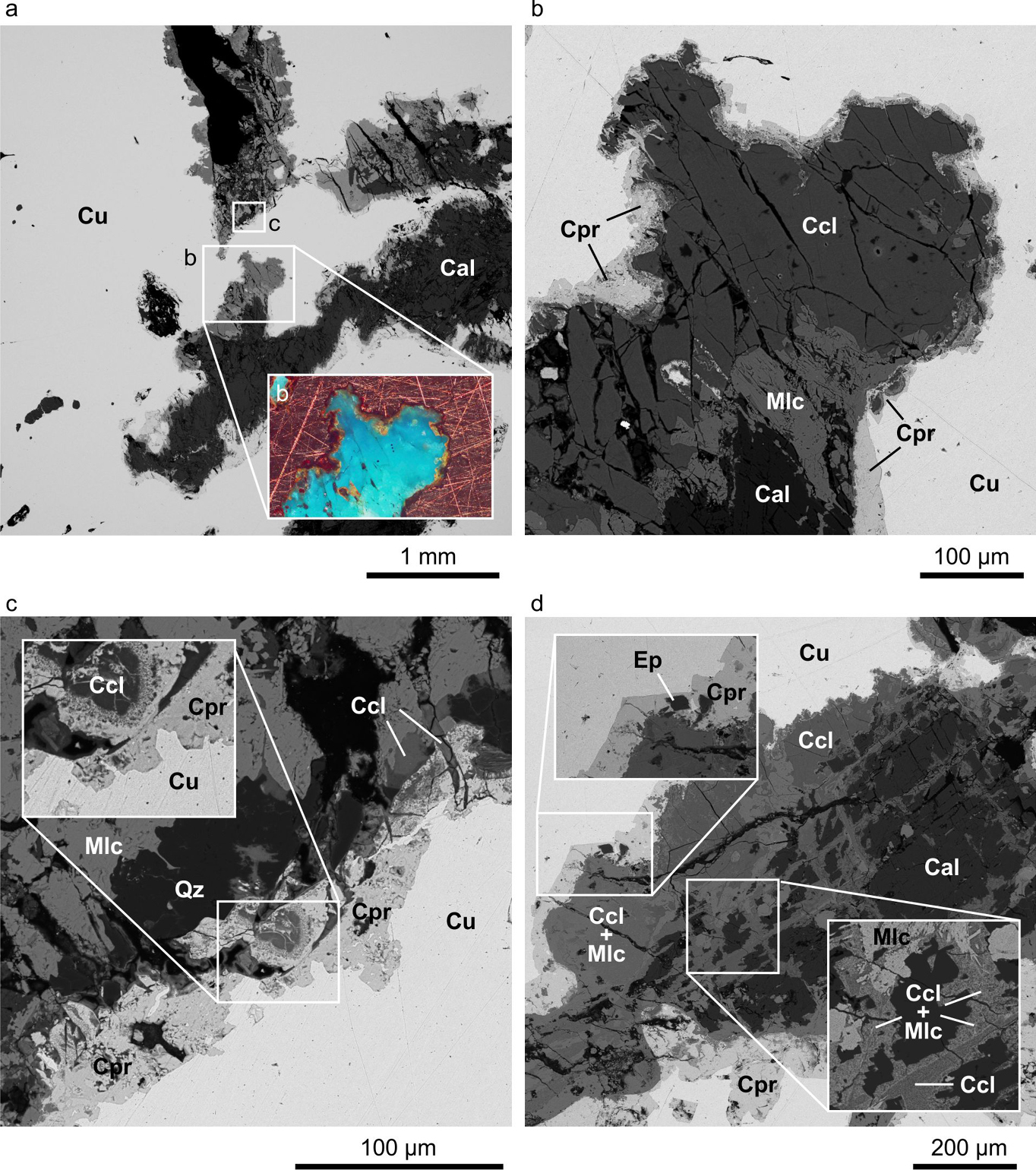 Keys: Cal – calcite; Ccl – chrysocolla; Cpr – cuprite; Cu – native copper; Ep – epidote; Mlc – malachite; Qz – quartz. SEM BSE images.