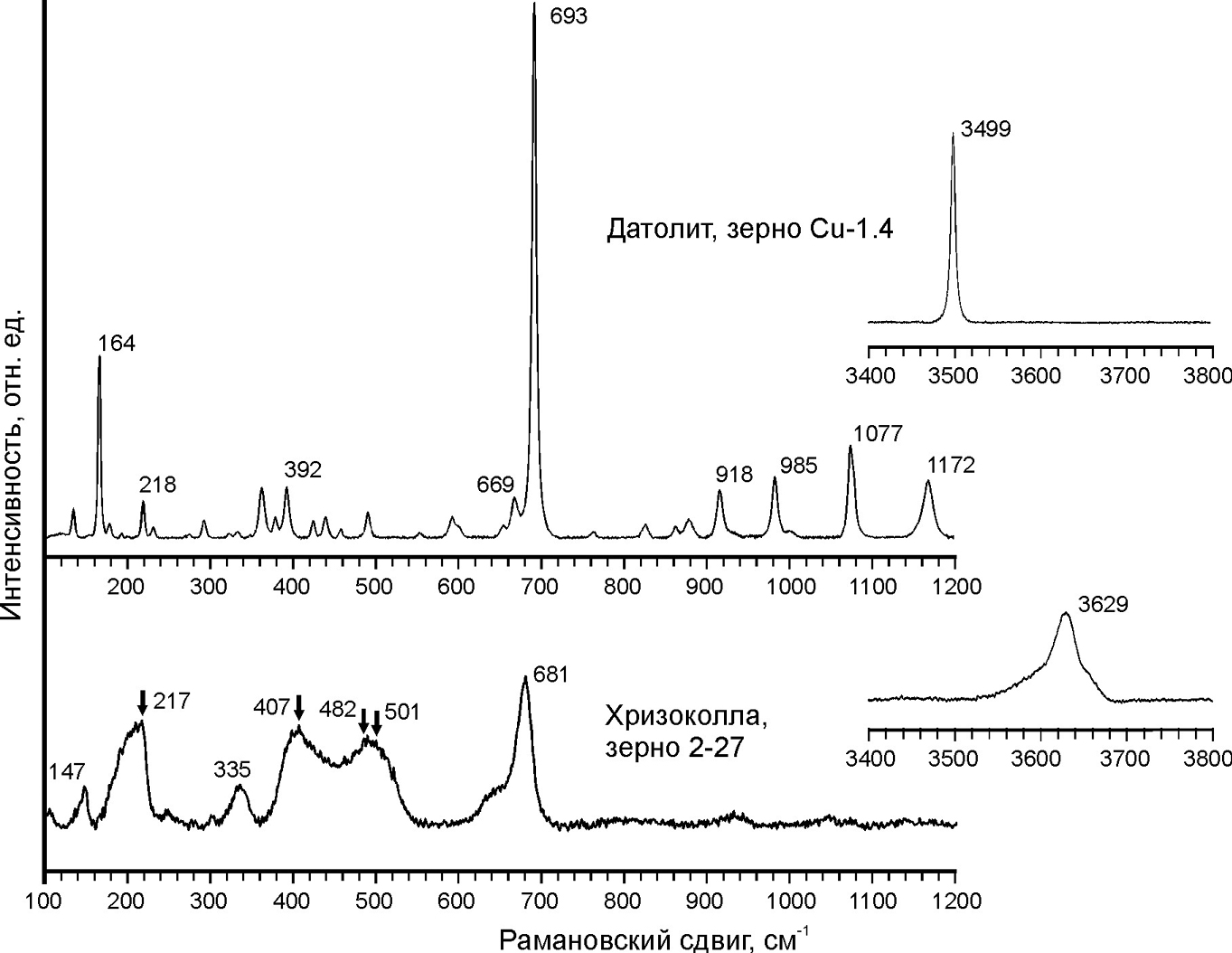 Для подтверждения идентификации бор- и водосодержащих минералов была проведена съемка их рамановских спектров, которые за счет относительно крупного размера зерен и хорошей фокусировки лазерного пучка получились практически без вклада спектральных линий вмещающих или соседствующих фаз. В спектре датолита (рис. 6) присутствуют основные линии 164 и 693 см-1, 3499 см-1 (OH-группа), а также ряд более слабых – в диапазоне 900–1200 см-1, с точностью до ±1 см-1, отвечающие модам колебаний BO, CaO и SiO в соответствующем окружении в структуре датолита [5]. Линии, полученные для хризоколлы, менее четкие и менее интенсивные, основные из них – 205–217, 335, 401–407, 482–501 и 681 см-1 (рис. 6). Кроме того, присутствует линия колебаний OH–группы с частотой 3629 см-1. Положение указанных спектральных линий в целом соответствует имеющимся для хризоколлы в базе RRUFF и данным из работы [6].