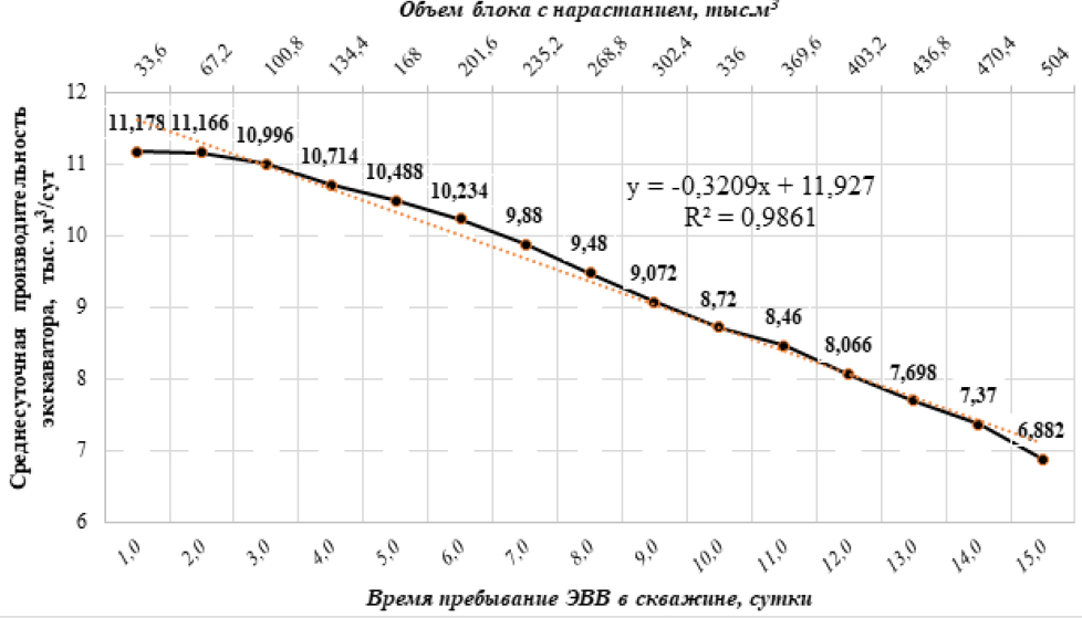 Параметры БВР исследуемых взрывных блоков приведены в таблице. В результате проведения экспериментальных взрывов выявлено, что при повышении объема взрывного блока в совокупности с увеличением времени его подготовки к выемке буровзрывным способом, зафиксировано уменьшение среднесуточной производительности экскаватора (рисунок). Это связано с увеличением времени нахождения ЭВВ в скважинах, и в связи с этим частичной потерей детонационных свойств ЭВВ [5] и, как следствие, снижения качества взорванной горной массы [13]. На рисунке указаны средние значения со среднесуточной производительностью экскаватора по результатам пяти экспериментальных взрывов.