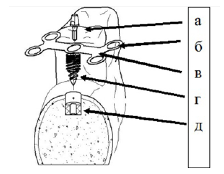 Выполнение экспериментально-клинических исследований осуществлялось на базе Самарской областной клинической больницы им. В.Д. Середавина. В исследовании приняло участие 116 человек (36 мужчин и 80 женщин). Средний возраст составил 48,3 года. Было установлено 167 дентальных внутрикостно-накостных имплантатов, все дентальные имплантаты были установлены на нижнюю челюсть. Имплантация проводилась следующим образом. Внутрикостная часть дентального имплантата представляла собой полую цилиндрическую втулку, состоящую из нетканого титанового материала [7]. Накостная часть состояла из дополнительных перфорационных отверстий для надежной фиксации и поднадкостничной пластинки (рис. 1).